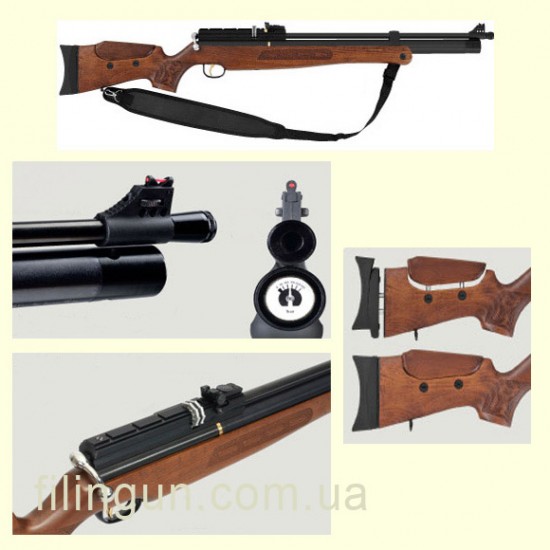 Новая модель пневматической винтовки системы РСР. Сменный десяти зарядный барабан ручной загрузки, задний затвор взвода. Баллон предварительно заряжен. Ствол винтовки нарезной. Есть возможность установки глушителя. Для установки требуется открутить крышечку на конце ствола. Эргономичный приклад из Турецкого ореха оснащен резиновой вставкой для лучшего сцепления с предплечьем. Высота щеки приклада легко отрегулировать при помощи монеты. Баллон съемный, что дает возможность использовать запасные баллоны. Встроенный манометр на торце баллона позволяет контролировать давление. Место для крепления оптического прицела типа ласточкин хвост 11 и 22 мм шириной. Регулируемые прицельная планка и мушка для удобства прицеливания оснащены световолокном. 2-х ступенчатый регулируемый спусковой механизм. Поставляется в комплекте с ремнём для ношения винтовки на плече.