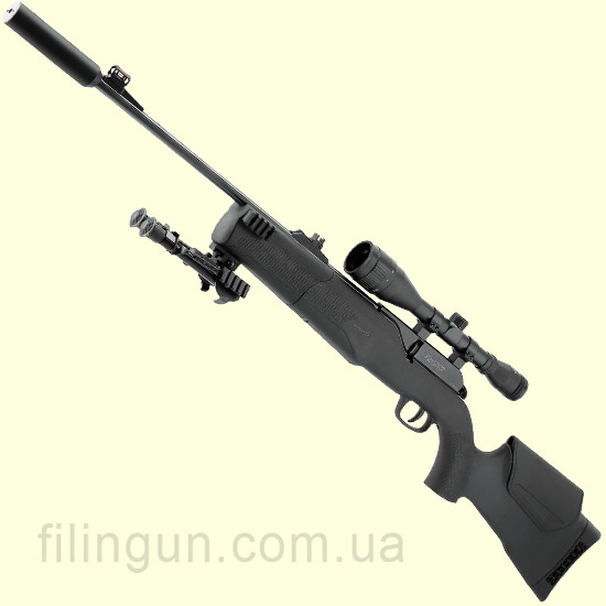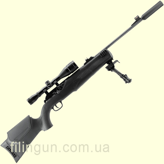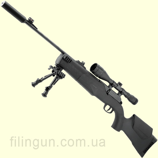 Сошки из комплекта помогают стабилизировать винтовку при стрельбе со стола или с упора, а глушитель делает выстрел более комфортным по уровню шума.