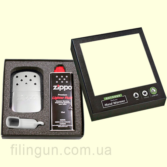 Подарочная коробочка для грелки Zippo 174625. Фирменная коробочка черного цвета для каталитической грелки придаст вашему подарку утонченности и презентабельности. В подарочной коробочке предусмотрено место для самой грелки, лейки для заправки и топлива Zippo на 125 мл.