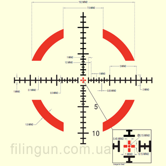 Сетка MRAD Segmented Circle Red/Green: Эта сетка обеспечивает быстрое и точное целеуказание, а также позволяет использовать красный или зеленый подсвет в зависимости от условий окружающей среды по 5 уровней на каждый цвет.