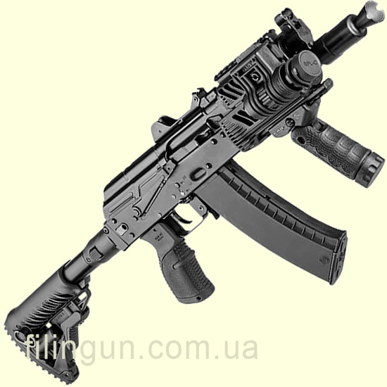 Складной приклад FAB Defense M4-AKS P M4 Buttstock for AKS-74U Krinkov предназначен для замены штатного приклада АКС 74У с полимерным соединением и обеспечивает повышенную тактическую универсальность. Буферная трубка изготовлена из пластика. Складывается в левую сторону и при этом остается достаточный зазор для доступа к спусковому крючку. Прорезиновый затыльник обеспечивает уменьшение отдачи при стрельбе. Длина регулируется с помощью клавиши и имеет несколько режимов фиксации. Присутствует два отверстия для установки быстросъемной поворотной антабки. Также есть отсек для хранения элементов питания для дополнительного оборудования. Присутствует пружинный фиксатор в сложенном положении, а открывается простым потягивающим движением. Простая установка, не требующая специализированных мастерских.