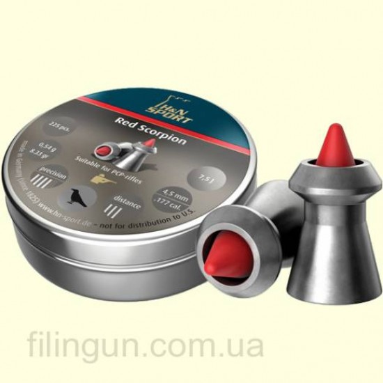 Высокоточные, средние по тяжести охотничьи пульки, предназначены, для стрельбы из пневматической винтовки класса магнум на оптимальную дистанцию 30 метров, являются пули для пневматического оружия Haendler & Natermann Red Scorpion. Усовершенствованный дизайн пульки Red Scorpion. Благодаря аэродинамической форме достигается высокая пробиваемая, приникающая способность и контролируемая деформация пули. Стрельба этой пулькой показывает высокую кучность. Поверхность пули для пневматического оружия Haendler Naterman Red Scorpion гладкая, с глубокой выемкой в передней части головки в которую вставлено полимерное острие.
