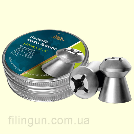Пули для пневматического оружия H&N Baracuda Hunter Extreme 6,35 мм 150 шт. относятся к тяжёлым охотничьим для стрельбы на дальние дистанции. В головной части пуля имеет очень глубокую крестообразную выемку для быстрой передачи энергии и высокого шокового воздействия. За счет того, что немецкие производители добились от пули хороших аэродинамических показателей, она стала очень точная. Поверхность гладкая.