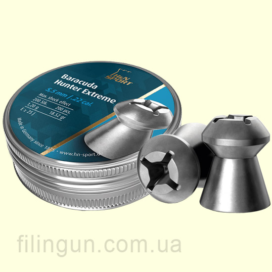 Пули для пневматического оружия Haendler & Natermann Baracuda Hunter Extreme 5,5 мм 200 шт относятся к тяжёлым охотничьим для стрельбы на дальние дистанции. В головной части пуля имеет очень глубокую крестообразную выемку для быстрой передачи энергии и высокого шокового воздействия. За счет того что немецкие производители добились от пули хороших аэродинамических показатель пуля стала очень точная. Поверхность пуль для пневматического оружия Haendler & Natermann Baracuda Hunter Extreme гладкая.