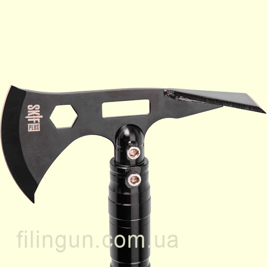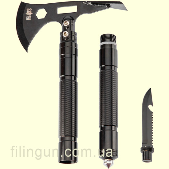Топор туристический Skif Plus Combat Axe будет прекрасным помощником в походе, на рыбалке, да и просто в багажнике автомобиля. Данная модель включает в себя: топор, нож, пила, кирка, открывалка для бутылок, ключ на 10 мм, стеклобой, свисток и огниво. Двухкомпонентная рукоятка изготовлена из алюминия, а полотно - из стали марки 420 и соединяются между собой с помощью резьбы.