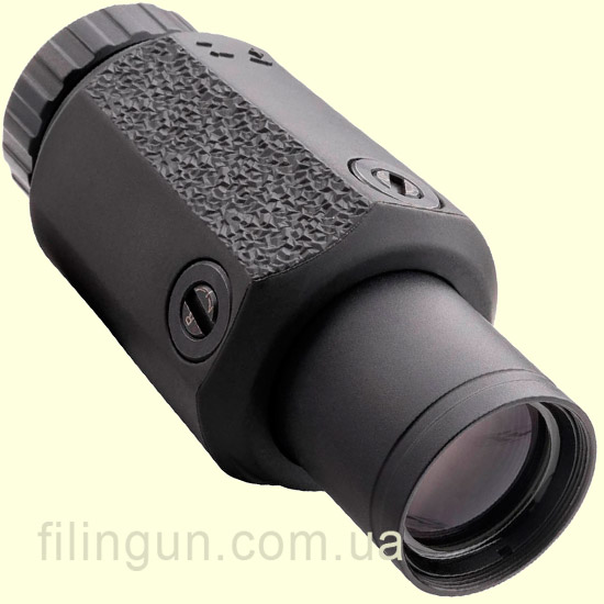 Разработанный для гражданского рынка, магнифер Aimpoint 3X-C (арт. 200273), может применяться со всеми коллиматорами Aimpoint, увеличивая при этом, до 3-х крат кратность прицела. Особенностью увеличителя является переменная (от -2 до +2) диоптрийная корректировка, позволяющая адаптировать его под зрение отдельного стрелка. Так же, стоит отметить, защитное резиновое покрытие корпуса и возможность юстировки по вертикали и горизонту для получения соосности с уже пристрелянным коллиматором. Для простоты установки рекомендуется производить монтаж при помощи быстросъемного крепления, но возможен и монтаж на кольца, диаметром 30 мм.