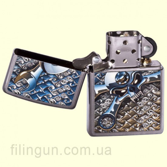 Классическая бензиновая зажигалка Zippo 200.035 Socket Spanner Brushed Chrome. Металлический корпус имеет матовое хромированное покрытие, благодаря чему на корпусе не остается следов от пальцев. На лицевой стороне изображение пиратского флага "Веселый Роджер" с торцевыми гаечными ключами вместо костей. Зажигалка Zippo упакована в фирменную подарочную коробочку с логотипом Zippo.