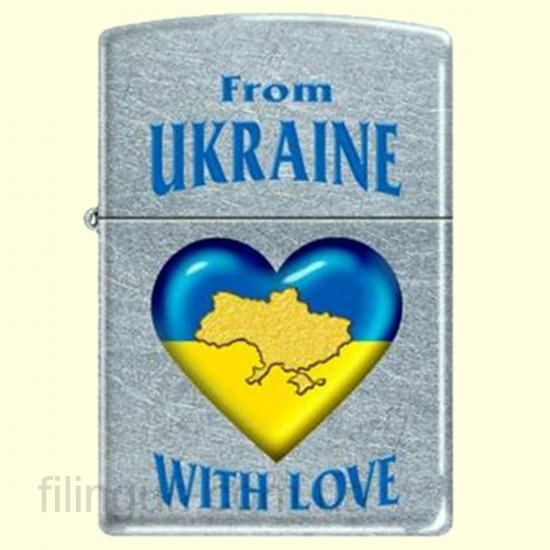 Классическая бензиновая зажигалка Zippo 207 FU From Ukraine with Love Street Chrome. Зажигалка из лимитированной серии Ukraine, приуроченной к Евро-2012. Металлический корпус имеет матовое, одно из самых неприхотливых, хромированное покрытие, на котором не остается следов от пальцев. На лицевой стороне изображено сердце с картой Украины внутри и надписью From Ukraine with Love (Из Украины с любовью). Зажигалка Zippo упакована в фирменную подарочную коробочку с логотипом Zippo.