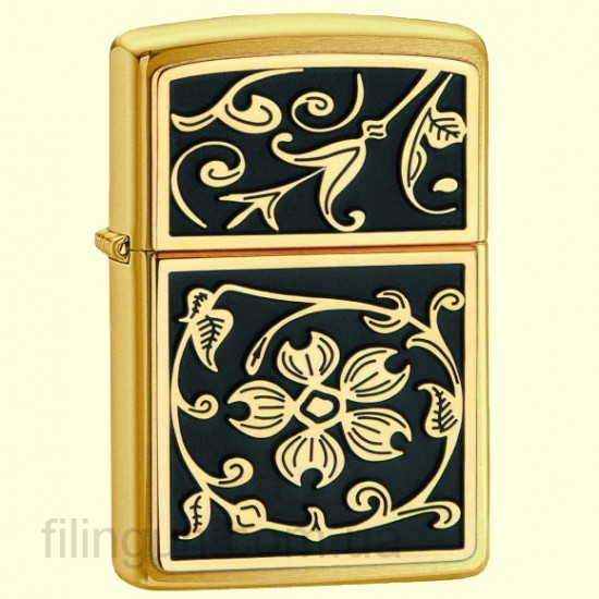 Классическая бензиновая зажигалка Zippo 20903 Gold Floral Emblem Brushed Brass. Медный корпус зажигалки имеет шлифованную поверхность, на которой не остается следов от пальцев. На лицевой стороне накладка из черной эмали с объемным цветочным орнаментом. Зажигалка Zippo упакована в фирменную подарочную коробочку с логотипом Zippo.