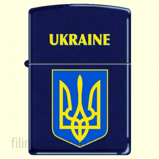 Классическая бензиновая зажигалка Zippo 239 UC Ukraine Coat of Arms 1 Navy Matte. Зажигалка из лимитированной серии Ukraine, приуроченной к Евро-2012. Металлический корпус имеет темно-синее матовое покрытие, стойкое к царапинам и стиранию. На лицевой стороне изображен малый Государственный Герб Украины с надписью Ukraine (Украина). Зажигалка Zippo упакована в фирменную подарочную коробочку с логотипом Zippo.