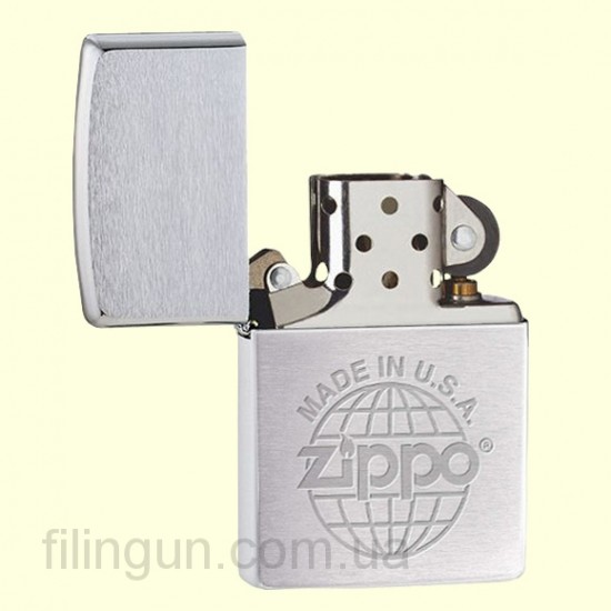 Классическая бензиновая зажигалка Zippo 274184 Made in USA Brushed Chrome. Металлический корпус имеет матовое хромированное покрытие, благодаря чему на корпусе не остается следов от пальцев. На лицевой стороне гравировка логотипа компании Zippo на фоне земного шара с надписью: Сделано в США. Зажигалка Zippo упакована в фирменную подарочную коробочку с логотипом Zippo.