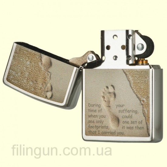 Классическая бензиновая зажигалка Zippo 28180 Footprint in the Sand Brushed Chrome. Металлический корпус имеет матовое хромированное покрытие, благодаря чему на корпусе не остается следов от пальцев. На лицевой стороне изображение следов на песке с объемным, мокрым эффектом волны. Зажигалка Zippo упакована в фирменную подарочную коробочку с логотипом Zippo.
