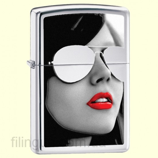 Классическая бензиновая зажигалка Zippo 28274 BS Sunglasses High Polish Chrome. Металлический корпус имеет глянцевое хромированное покрытие. На лицевой стороне изображение девушки в солнечных очках. Зажигалка Zippo упакована в фирменную подарочную коробочку с логотипом Zippo.
