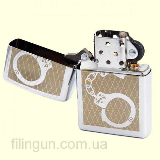 Классическая бензиновая зажигалка Zippo 28287 Handcuff Bling High Polish Chrome. Металлический корпус имеет глянцевое хромированное покрытие. На лицевой стороне под незатейливым гравированным узором спрятан рисунок полицейских наручников. Зажигалка Zippo упакована в фирменную подарочную коробочку с логотипом Zippo.