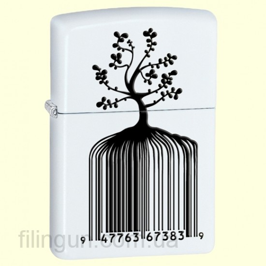 Классическая бензиновая зажигалка Zippo 28296 Identity Tree Barcode White Matte. Металлический корпус имеет белое матовое покрытие, стойкое к царапинам и стиранию. На лицевой стороне изображение дерева со штрих кодом вместо корней. Зажигалка Zippo упакована в фирменную подарочную коробочку с логотипом Zippo.