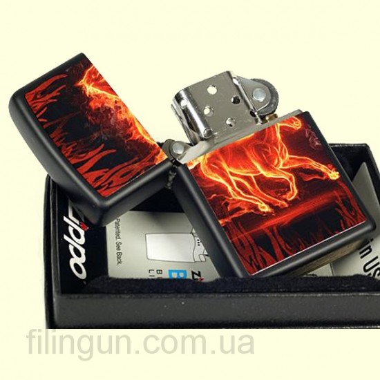 Классическая бензиновая зажигалка Zippo 28304 Flaming Horse Black Matte. Металлический корпус имеет черное матовое покрытие, стойкое к царапинам и стиранию. На лицевой стороне изображение бегущей огненной лошади. Зажигалка Zippo упакована в фирменную подарочную коробочку с логотипом Zippo.
