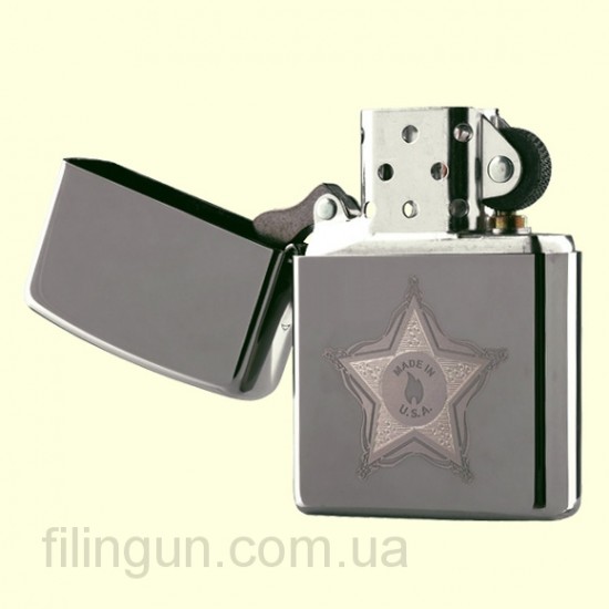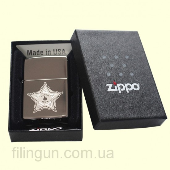 Классическая бензиновая зажигалка Zippo 28360 Skull Badge Black Ice. Металлический корпус имеет красивую темно-дымчатую, глянцевую поверхность. В обработке поверхности корпуса зажигалки применена запатентованная компанией, специальная PVD технология, придающая высокую стойкость поверхности к истиранию и появлению царапин. На лицевой стороне изображение пятиконечной звезды, напоминающей значок шерифа, с логотипом Zippo в середине. Зажигалка Zippo упакована в фирменную подарочную коробочку с логотипом Zippo.