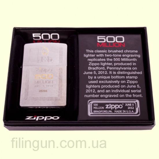 Классическая бензиновая зажигалка Zippo 28412 500 Million Limited Edition Brushed Chrome. Коллекционная, лимитированная зажигалка Zippo, выпуск которой приурочен к выпуску 500 миллионной зажигалки. Матовая хромированная поверхность зажигалки стилизована богатым золотистым узором, нанесенным методом двухцветного лазерного гравирования. На донышке корпуса уникальный штамп подтверждающий, что она выпущена именно 5 июня 2012 года и индивидуальный порядковый номер выгравированный на лицевой стороне. Зажигалка Zippo поставляется в фирменной подарочной упаковке, специально разработанной для этого события.