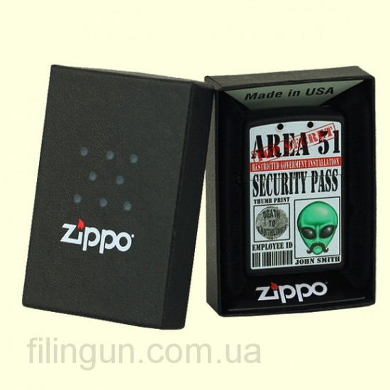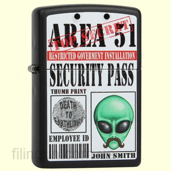 Классическая бензиновая зажигалка Zippo 28437 Fantasy Black Matte. Металлический корпус имеет черное матовое покрытие стойкое к царапинам и стиранию. На лицевой стороне фантазийное изображение пропуска пришельца Джона Смита в засекреченную зону. Зажигалка Zippo упакована в фирменную подарочную коробочку с логотипом Zippo.
