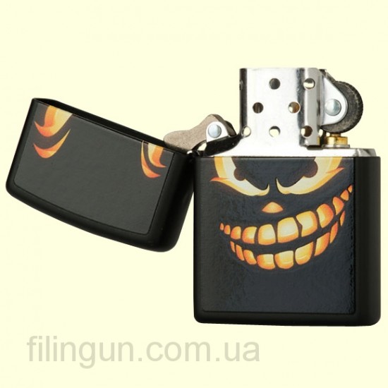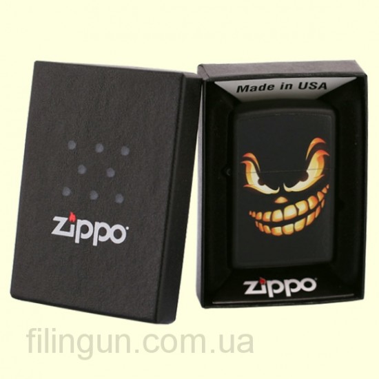 Классическая бензиновая зажигалка Zippo 28439 Scary Jack O Lantern Black Matte. Металлический корпус имеет черное матовое покрытие стойкое к царапинам и стиранию. На лицевой стороне изображение страшного Джека - тыквы фонаря. Зажигалка Zippo упакована в фирменную подарочную коробочку с логотипом Zippo.