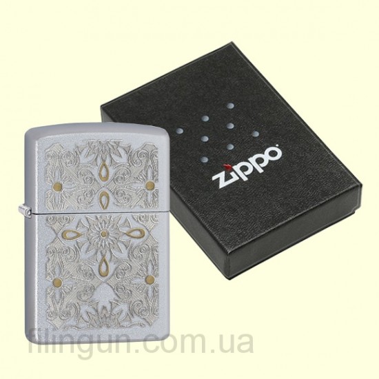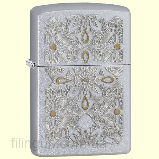 Классическая бензиновая зажигалка Zippo 28457 Classical Curve Satin Chrome. Металлический корпус имеет матовое, приятное на ощупь, хромированное покрытие обработанное по технологии сатинирования (лощения) - благодаря чему на корпусе не остается следов от пальцев. На лицевой стороне двухцветная гравировка цветочного орнамента. Эффект золота и серебра достигается гравированием в двух различных плоскостях - яркого хромированного покрытия и латунной основы. Зажигалка Zippo упакована в фирменную подарочную коробочку с логотипом Zippo.
