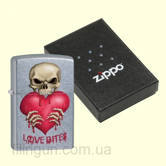 Классическая бензиновая зажигалка Zippo 28464 Love Bites Street Chrome. Металлический корпус имеет матовое, одно из самых не прихотливых, хромированное покрытие, на котором не остается следов от пальцев. На лицевой стороне изображение скелета кусающего сердце, с надписью: "Люблю кусать". Зажигалка Zippo упакована в фирменную подарочную коробочку с логотипом Zippo.