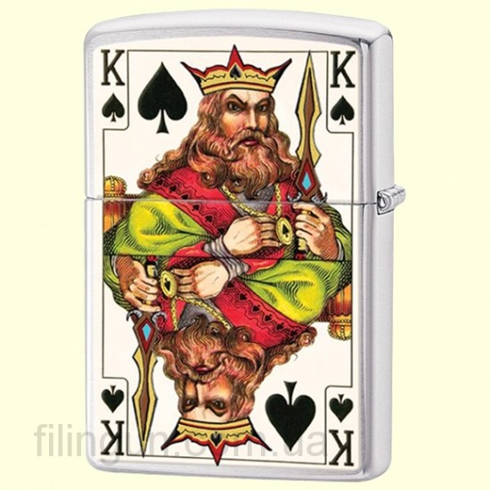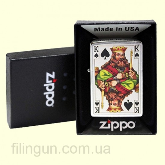 Классическая бензиновая зажигалка Zippo 28489 King Brushed Chrome. Металлический корпус имеет матовое хромированное покрытие, благодаря чему на корпусе не остается следов от пальцев. Зажигалка с двухсторонним изображением доброго и злого пикового короля. Зажигалка Zippo упакована в фирменную подарочную коробочку с логотипом Zippo.