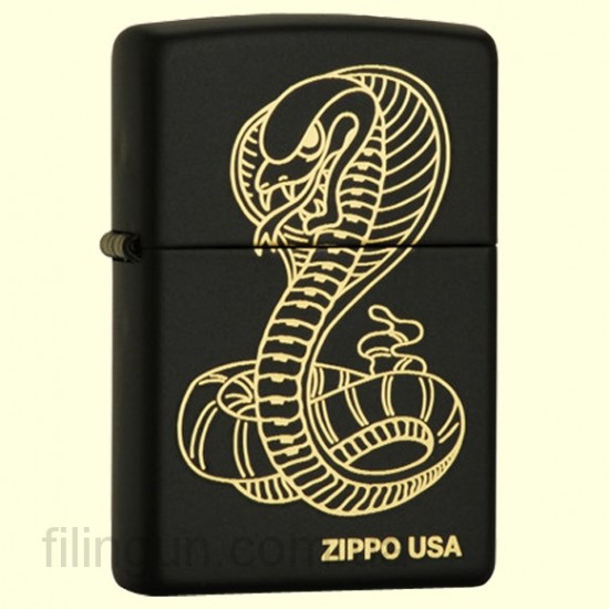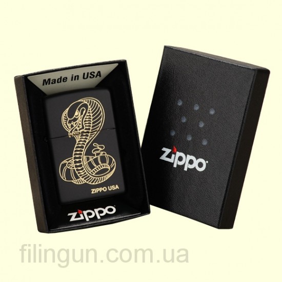 Классическая бензиновая зажигалка Zippo 28551 Snake Black Matte. Металлический корпус имеет черное матовое покрытие стойкое к царапинам и стиранию. На лицевой стороне изображение кобры. Зажигалка Zippo 28551 входит в лимитированную коллекцию зажигалок 2013 года, отличительной особеностью которой, является незатейливый рисунок и приемлемая цена. Зажигалка Zippo упакована в фирменную подарочную коробочку с логотипом Zippo.
