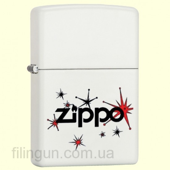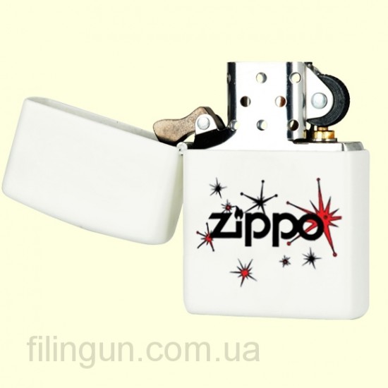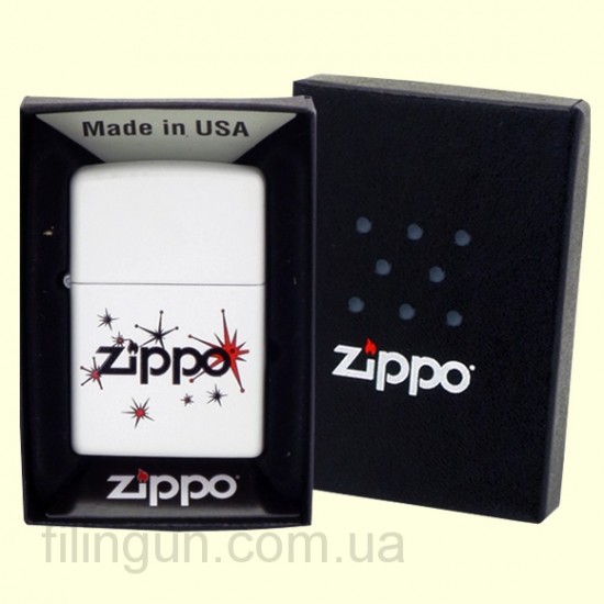 Классическая бензиновая зажигалка Zippo 28557 Vintage Stars White Matte. Металлический корпус имеет белое матовое покрытие стойкое к царапинам и стиранию. На лицевой стороне изображение логотипа Zippo украшают винтажные звезды, намоминающие праздничный салют. Зажигалка Zippo 28557 входит в лимитированную коллекцию зажигалок 2013 года, отличительной особеностью которой, является незатейливый рисунок и приемлемая цена. Зажигалка Zippo упакована в фирменную подарочную коробочку с логотипом Zippo.
