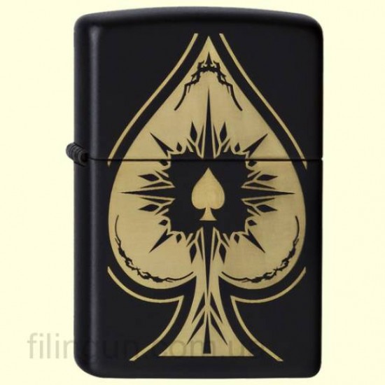 Классическая бензиновая зажигалка Zippo 28662 Ace of Spades Black Matte. Металлический корпус имеет черное матовое покрытие, стойкое к царапинам и стиранию. На лицевой стороне золотистое изображение карточной пиковой масти. Зажигалка Zippo упакована в фирменную подарочную коробочку с логотипом Zippo.
