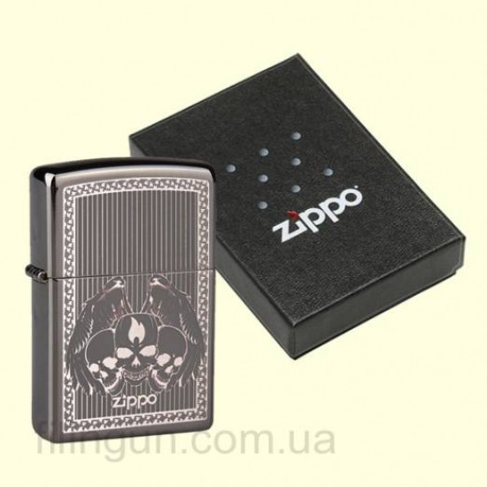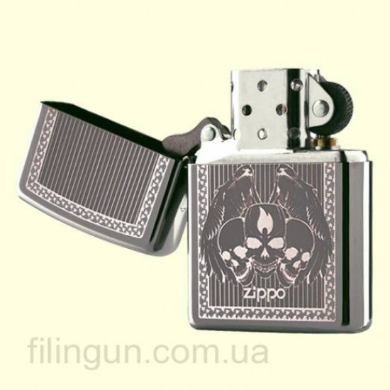 Классическая бензиновая зажигалка Zippo 28678 Iced Skulls Ebony. Металлический корпус имеет красивую глянцевую поверхность насыщенного черного цвета. В обработке поверхности корпуса зажигалки применена запатентованная компанией, специальная PVD технология, придающая высокую стойкость поверхности к истиранию и появлению царапин. На лицевой стороне изображение трех черепов с крыльями ангела за ними, логотипом Zippo и пламени на фоне продольных полос. Зажигалка Zippo упакована в фирменную подарочную коробочку с логотипом Zippo.