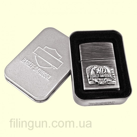 Классическая бензиновая зажигалка Zippo 390.001 Harley Davidson Pewter Emblem Silver Sunrise. Металлический корпус имеет стилизованное состаренное покрытие под серебро с продольным рисунком имитирующим шлифовку, на котором не остается следов от пальцев. На лицевой стороне объемная оловянная эмблема с логотипом всемирно известной американской марки мотоциклов Harley Davidson. Зажигалка Zippo упакована в фирменную подарочную коробочку.