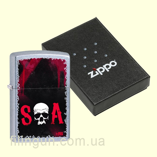 Классическая бензиновая зажигалка Zippo 28836 SOA Street Chrome. Металлический корпус имеет матовое, одно из самых не прихотливых, хромированное покрытие, на котором не остается следов от пальцев. На лицевой стороне изображение черепа с надписью SOA (Sons of Anarchy). Поставляется в подарочной коробочке черного цвета, созданной из экологически чистых материалов, с фирменным логотипом компании.