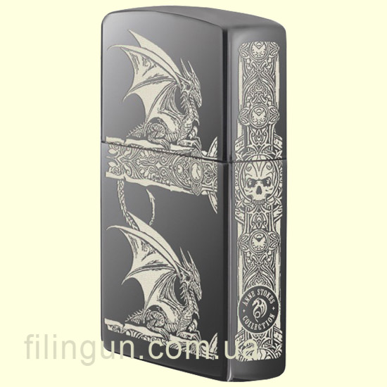 Классическая бензиновая зажигалка Zippo 28961 Anne Stokes Gothic Dragon Black Ice. Металлический корпус имеет красивую темно-дымчатую, глянцевую поверхность. В обработке поверхности корпуса зажигалки применена запатентованная компанией, специальная PVD технология, придающая высокую стойкость поверхности к истиранию и появлению царапин. На лицевой стороне и торце зажигалки, методом лазерной гравировки нанесен сложный рисунок дракона в стиле фентези, от английской художницы-иллюстратора Anne Stokes (Энн Стоукс). Зажигалка Zippo упакована в фирменную подарочную коробочку с логотипом Zippo.