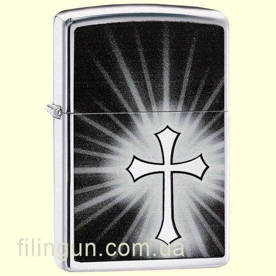 Классическая бензиновая зажигалка Zippo 29074 Reflective Cross High Polish Chrome. Металлический корпус имеет глянцевое хромированное покрытие. На лицевой стороне изображение излучающего свет креста. Поставляется в подарочной коробочке черного цвета, созданной из экологически чистых материалов, с фирменным логотипом компании.