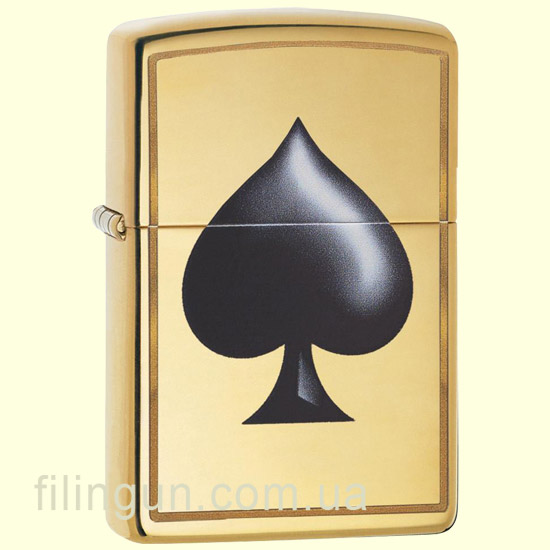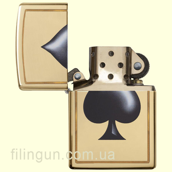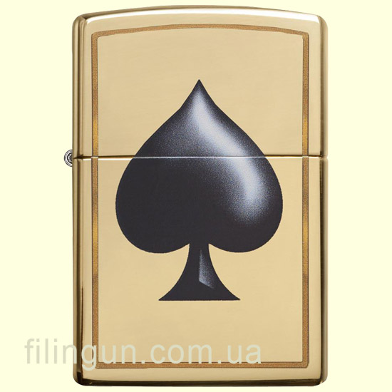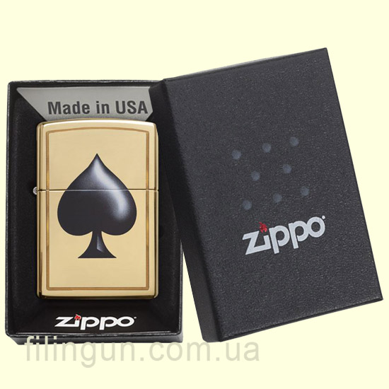 Классическая бензиновая зажигалка Zippo 29094 Spade High Polish Brass. Латунный корпус имеет гладкую зеркальную поверхность, что придаёт этой зажигалке - особую элегантность. На лицевой стороне цветная накатка карточной пиковой масти. Поставляется в подарочной коробочке черного цвета, созданной из экологически чистых материалов, с фирменным логотипом компании.