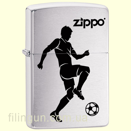 Классическая бензиновая зажигалка Zippo 29201 Soccer Player Brushed Chrome. Металлический корпус имеет матовое хромированное покрытие, благодаря чему на корпусе не остается следов от пальцев. На лицевой стороне изображение силуэта футболиста с мячом. Поставляется в подарочной коробочке черного цвета, созданной из экологически чистых материалов, с фирменным логотипом компании.