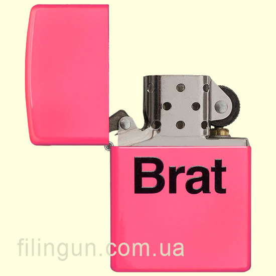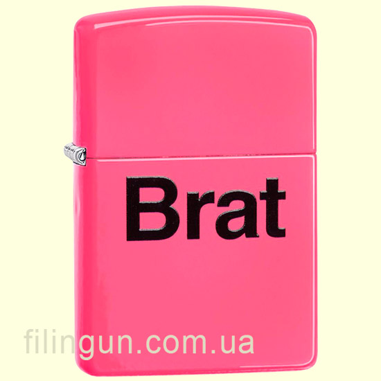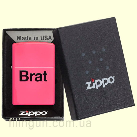 Классическая бензиновая зажигалка Zippo 29405 Brat Neon Pink. Металлический корпус имеет блестящее, полуглянцевое покрытие неоново-розового цвета, стойкое к царапинам и стиранию. На лицевой стороне надпись: "Brat". Поставляется в подарочной коробочке черного цвета, созданной из экологически чистых материалов, с фирменным логотипом компании.