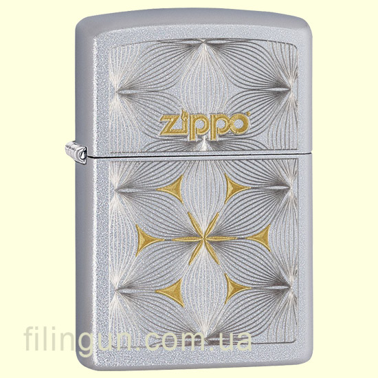 Классическая бензиновая зажигалка Zippo 29411 Flowers Satin Chrome. Металлический корпус имеет матовое, приятное на ощупь, хромированное покрытие обработанное по технологии сатинирования (лощения) - благодаря чему на корпусе не остается следов от пальцев. На лицевой стороне двухцветная гравировка Zippo на фоне цветочного орнамента в стиле арт-деко. Эффект золота и серебра достигается гравированием в двух различных плоскостях - яркого хромированного покрытия и латунной основы. Зажигалка Zippo упакована в фирменную подарочную коробочку с логотипом Zippo.