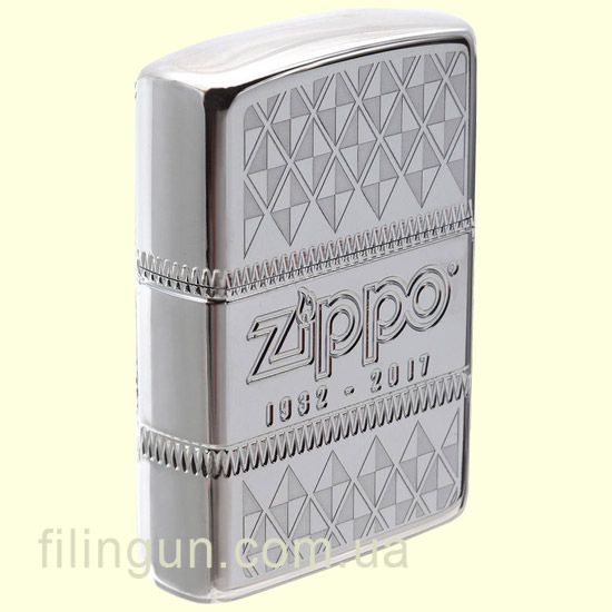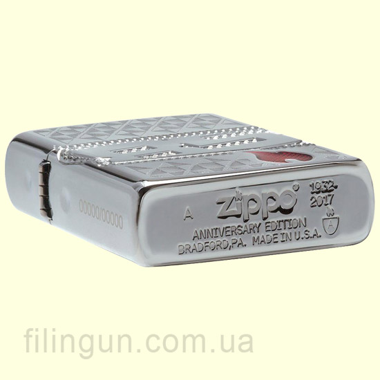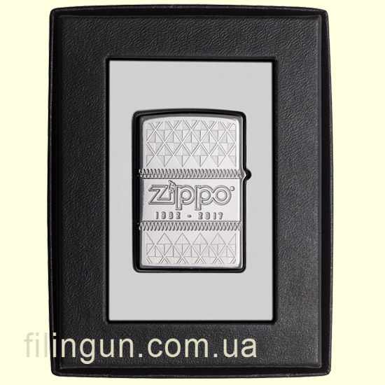 Армированная бензиновая зажигалка Zippo 29442 Armor 85th Limited Edition High Polish Chrome. Коллекционная зажигалка Zippo, выпуск которой приурочен к 85-ти летию основания компании. Глянцевая хромированная зажигалка с двух сторон стилизованна красивой многогранной гравировкой (технология 360-MultiCut) в виде ромбовидного узора, юбилейной даты, логотипа компании и фирменного огонька из эпоксидной смолы. Помимо традиционных элементов маркировки на донном штампе присутствует надпись "Anniversary edition", дата 1932-2017 и логотип, свидетельствующий о принадлежности модели к армированной серии. Каждая юбилейная зажигалка имеет свой порядковый номер и поставляется в открытой подарочной упаковке, специально разработанной для этого события.