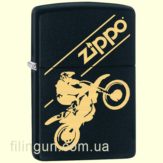 Классическая бензиновая зажигалка Zippo 29528 Motocross Black Matte. Металлический корпус имеет черное матовое покрытие стойкое к царапинам и стиранию. На лицевой стороне изображение мотоциклиста с логотипом компании. Поставляется в подарочной коробочке черного цвета, созданной из экологически чистых материалов, с фирменным логотипом компании.