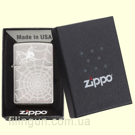 Классическая бензиновая зажигалка Zippo 29534 Spider Web Black Widow Brushed Chrome. Металлический корпус имеет матовое хромированное покрытие, благодаря чему на корпусе не остается следов от пальцев. На лицевой стороне изображение паутины и Черной вдовы на ней. Зажигалка Zippo упакована в фирменную подарочную коробочку с логотипом Zippo.