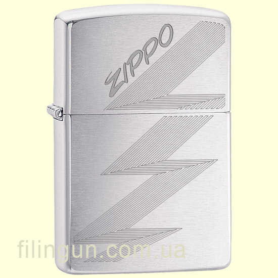 Классическая бензиновая зажигалка Zippo 29683 Logo Design Brushed Chrome. Металлический корпус имеет матовое хромированное покрытие. На лицевой стороне гравировка в виде молнии с ретро логотипом компании. Поставляется в подарочной коробочке черного цвета, созданной из экологически чистых материалов, с фирменным логотипом компании.