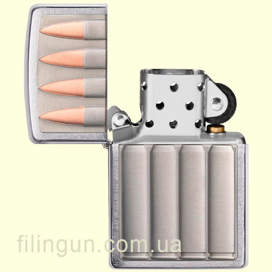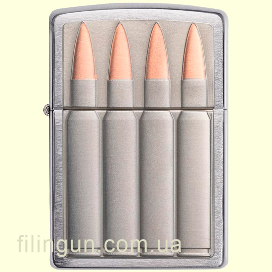 Классическая бензиновая зажигалка Zippo Zippo 29821 Bullets Emblem Brushed Chrome. Металлический корпус имеет матовое хромированное покрытие. На лицевой стороне объемная эмблема с изображением боеприпасов. Поставляется в подарочной коробочке черного цвета, созданной из экологически чистых материалов, с фирменным логотипом компании.