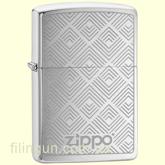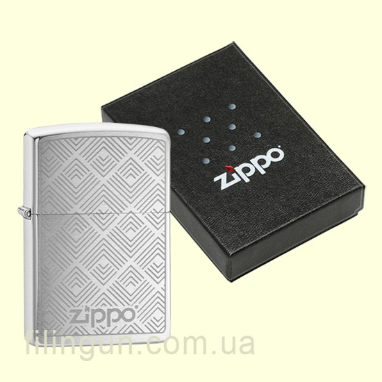 Классическая бензиновая зажигалка Zippo 29921 Pyramid Shapes Design Brushed Chrome. Металлический корпус имеет матовое хромированное покрытие. На лицевой стороне гравировка логотипа компании на фоне геометрического орнамента. Поставляется в подарочной коробочке черного цвета, созданной из экологически чистых материалов, с фирменным логотипом компании.