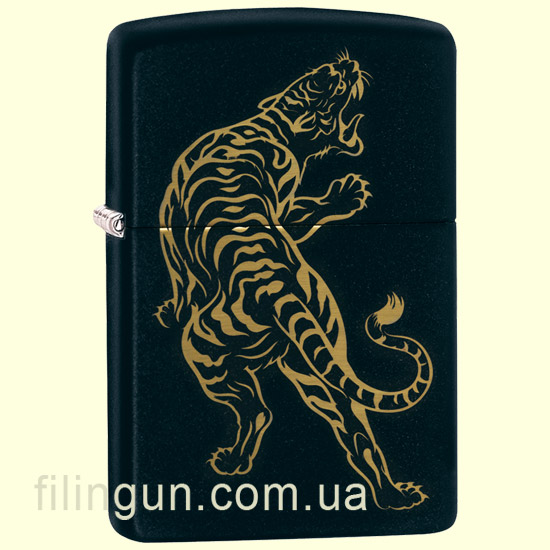 Классическая бензиновая зажигалка Zippo 29924 PF19 Tiger Design Black Matte. Металлический корпус имеет черное матовое покрытие стойкое к царапинам и стиранию. На лицевой стороне методом лазерной гравировки нанесено стилизованное изображение тигра. Поставляется в подарочной коробочке черного цвета, созданной из экологически чистых материалов, с фирменным логотипом компании.