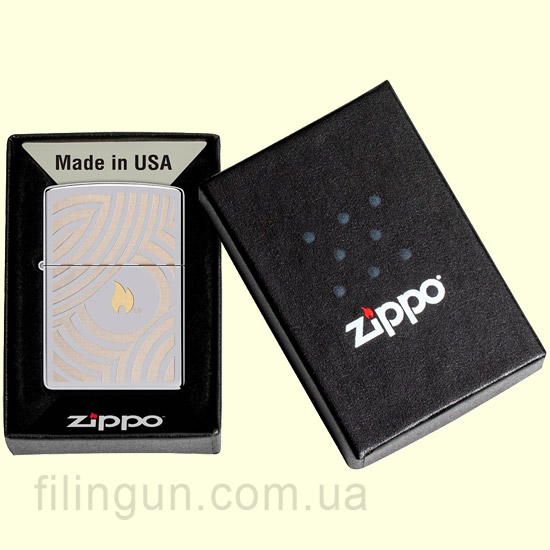 Zippo 46332 обладает хромированной глянцевой поверхностью High Polish Chrome и выделяется своим уникальным дизайном. На лицевой стороне изображено традиционное пламя Zippo, выделяющееся на фоне узора из кругов, выполненного с помощью гравировки что придаёт зажигалке современный и привлекательный вид. Это идеальный аксессуар для людей, которые ценят эстетику и индивидуальность.
