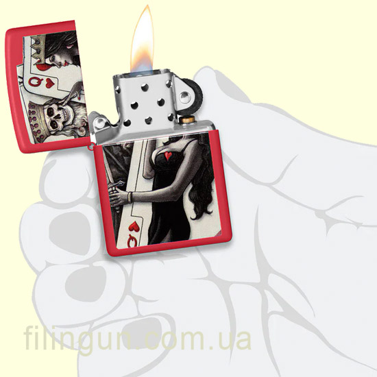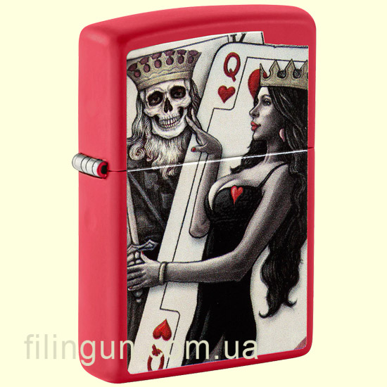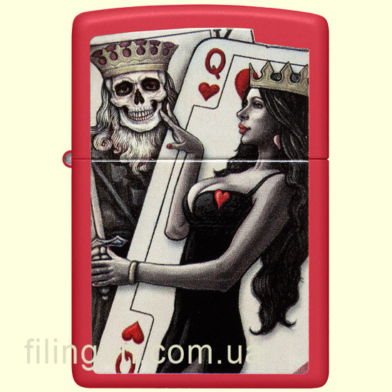 Классическая бензиновая ветрозащитная зажигалка Zippo 48624 Skull King Queen Beauty Red Matte может заинтересовать как практический аксессуар к повседневному образу для разжигания огня, так и в качестве элемента стиля. Она имеет прочный металлический корпус с покрытием Red Matte, которое придает ей матовую текстуру и огненно-красный цвет. На лицевой стороне зажигалки, при помощи процесса Color Image, нанесено полюбившееся многим, оригинальное изображение пары игральных карт - пикового короля и дамы червей.