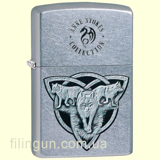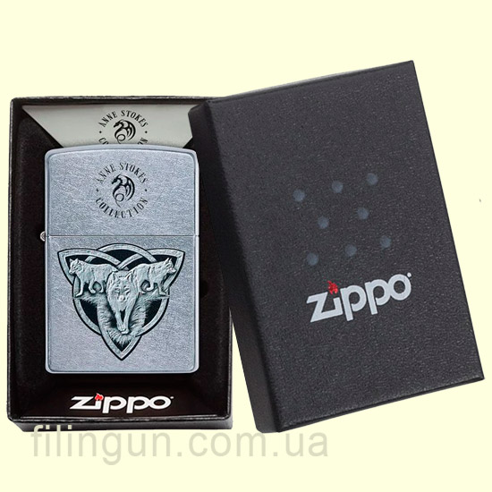 Классическая бензиновая ветрозащитная зажигалка Zippo 49099 ANNE STOKES Wolf Pack Street Chrome. Металлический корпус имеет матовое, одно из самых не прихотливых, хромированное покрытие, на котором не остается следов от пальцев. На лицевой стороне нанесено изображение волчьей стаи с трикветром на заднем плане и логотипом английской художницы-иллюстратора Anne Stokes (Энн Стоукс) на крышке. Упакована в фирменную подарочную упаковку с логотипом Zippo. Для превосходной работы используйте только фирменное топливо Zippo.
