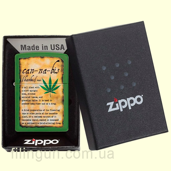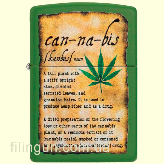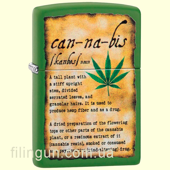 Бензиновая ветрозащитная зажигалка Zippo 49119 Cannabis Design Moss Green Matte. Металлический корпус имеет зеленое матовое покрытие, стойкое к царапинам и стиранию. На лицевой стороне нанесено оригинальное изображение в виде книжного энциклопедического листа с разъяснением понятия конопли. Упакована в фирменную подарочную упаковку с логотипом Zippo. Для превосходной работы используйте только фирменное топливо Zippo.